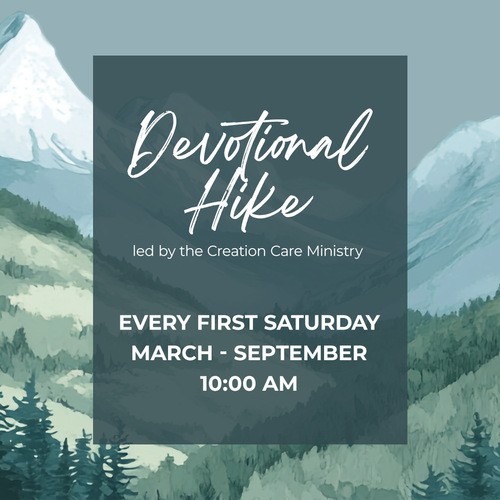 Devotional Hikes will take place at 10:00 a.m. on the first Saturday of each month from March through September. These hikes offer a meaningful time to connect with God through scripture, reflection, and the beauty of the outdoors. Locations will vary each month, and a rain plan will always be provided. All are welcome to join us!
