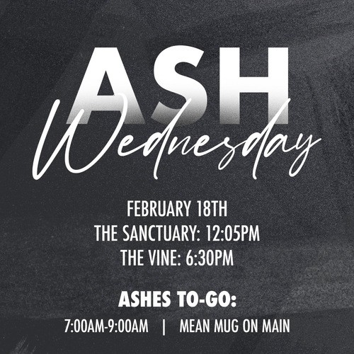 Join us on February 18th for one of our Ash Wednesday services, with opportunities to receive the imposition of ashes and enter this holy season together. Services will be held at 12:05 p.m. in the Sanctuary and 6:30 p.m. in The Vine.